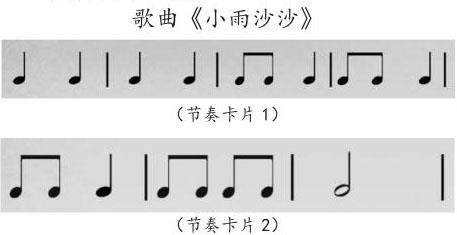 在本单元的教学活动中,主要目的是通过演唱歌曲,感受体验大自然的美,培养学生热爱大自然的情感。在这个任务驱动下,教师要根据小学低年段学生的学习情况制订生动有趣的音乐活动,并且在互动中充分发挥学生的主体性地位,让学生有效观察生活中令人感到愉悦的场景。柯达伊教学法中的节奏训练可以让整个课堂活跃起来。本单元活动的设计思路可以节奏训练法为主线,设置以听、念、拍的音乐活动。具体操作流程是当本单元的《早上好》歌曲教学完成后,教师可以带领学生通过小三度音程模唱的提示,回顾小学音乐一年级下册歌曲《小雨沙沙》,其是2/4拍,五声调式,四乐句一段体结构。歌词整体的节奏较为轻快、明朗,富有节奏感,适合采用柯达伊的节奏训练法开展教学活动。在此环节中,当学生在教师的提示下唱出《小雨沙沙》时,教师要带着学生集体复习“二拍子”伴奏方法,一拍拍手,二拍拍手腕,通过二拍子的强弱特点,感受雨滴啪嗒落下生动的情景。此方式可以让学生较快地熟练这首歌曲的稳定拍与旋律。这时,教师就可以引导学生从已经熟悉的歌曲中分离出节奏,进行口读和手拍。例如,四分音符读作“ta”,两个八分音符读作“titi”,然后利用节奏卡片进行带有游戏性质的节奏组合游戏,从而帮助学生分辨出这首歌曲的曲式结构。