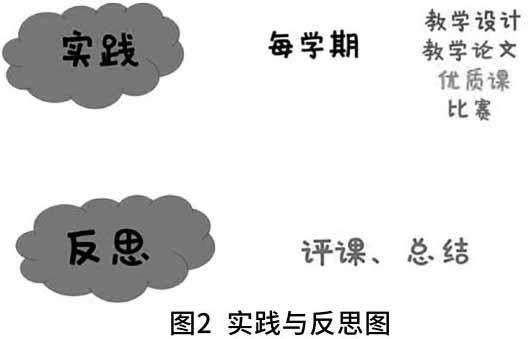从工作第一年开始,在工作室主持人陈晓丹老师指导下,每学期我需要完成实践和反思两个部分。实践部分包含一份高质量教学设计、一份高质量教学论文、一篇高质量课堂实录和参加基本功比赛或指导学生参赛;反思部分包含评课、写反思(详见图2)。