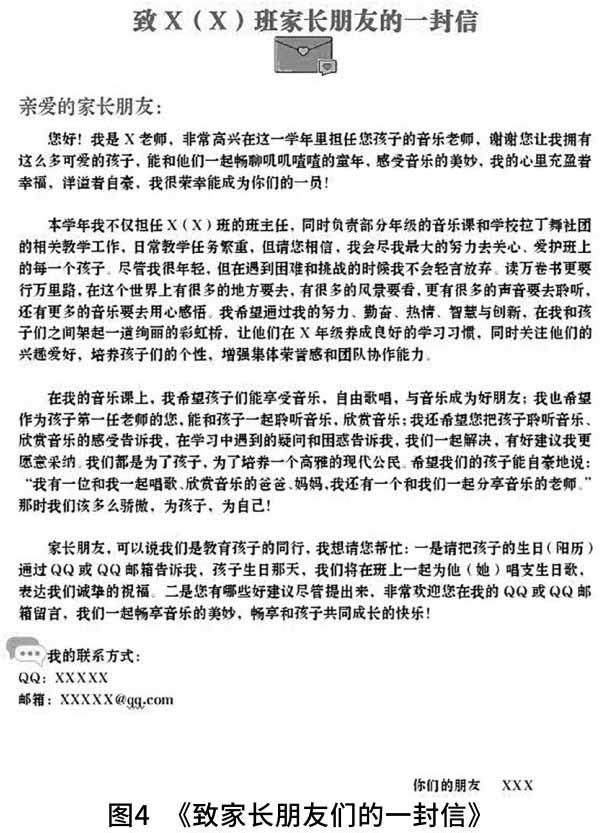 每学期开学时,我会写一封致家长朋友们的信(详见图4)。信中我向家长们介绍我是孩子的音乐和竖笛老师,希望家长们通过QQ或者邮箱将孩子的生日时间发给我,在孩子生日的那天,我们将会在音乐课上一起为他(她)唱支生日歌,表达我们诚挚的祝福。信发出去后,同样,我也陆续收到了家长们的回信和反馈,信中家长提到:“黄老师教竖笛课的一年时间里,我们家长感受到了黄老师的努力、勤奋、热情、智慧与创新。每次收到黄老师亲手写的‘快乐小纸条’,好特别,太与众不同了!”尽管我只是一名音乐教师,但通过信笺传递,我与学生、家长架起了一道信任的桥梁。有了信任和爱,才能有效地开展班级管理工作,做到家校互联。