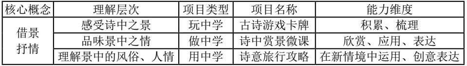 例如,围绕“在心为志”之“借景抒情”大观念的项目群,就由古诗游戏卡牌、诗中赏景微课和诗意旅行攻略三个诗歌小项目组成。其设计思路如下表: