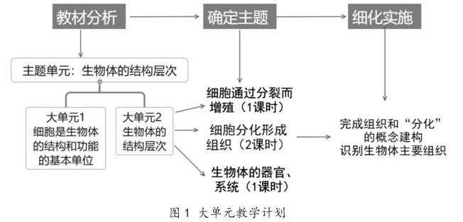 经过概括可得出本单元需建构的大概念——生物体具有一定的结构层次,能够完成各项生命活动。《细胞分化形成组织》一课的任务要求是完成“细胞分化和组织”的概念建构和学习生物体的主要组织。基于此,教师把本主题分成3个内容和4个课时进行学习(见图1)。