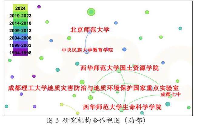 同核心作者分析,本研究共涉及222所研究机构,其中19所机构发文量在3篇以上。仅有5所中学发文量达3篇,其余均为高校、研究院所及出版社。各研究机构间合作相对较少,地方中学往往与地方大学或研究院所存在合作关系(图3)。这表明本土化的高校与中学常进行理论与实践的交互,是一种较好实施中学环境教育的模式,然而仅有3所中学与高校存在合作关系,合作数量仍较少。