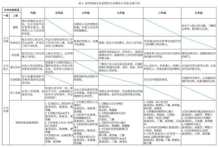 【摘要】本文从培育中小学生积极生命态度角度出发,围绕人与自我、人与他人、人与处境三个向度及理想、生命自主、存在感、爱与关怀、生命经验、死亡态度六个维度,借助专业心理老师的力量开发了22节从五年级至九年级契合年龄特点凸显年级特色的积极生命态度心育班会课,希望能为生命教育带来新的角度和思考。