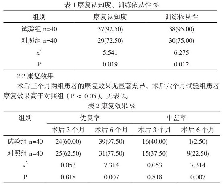 比较两组患者康复认知度、训练依从性(采用问卷星调查患者疾病认知度及训练依从性,两项测试分别为50道题,满分100分,选项包括是、否,统计分数≥60分患者概率)、康复效果(根据患者的肩关节功能恢复情况判定,包括关节疼痛、功能、活动度方面,满分100分,分数超过90分-优、80-89-良、70-79-中、<70-差,统计患者术后3、6个月的优良率,优良率=(优+良)/病例数×100%)。