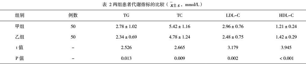 乙组TG、TC、LDL-C低于甲组,HDL-C高于甲组(P<0.05),见表2。