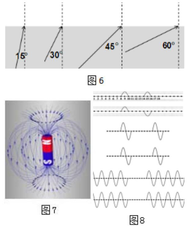 物理来源于生活,又反作用于生活!物理规律概念是科学家对纷繁复杂的自然现象进行观察、总结出来的,是一种高度的抽象和概括,所以从规律概念的形成本源来看,与生俱来的学习难度!教学设计时必须创造出适切的生活场景,让学生沉浸在熟悉的生活情境中,去体会物理知识的产生过程。如在进行机械波教学导入时,给学生投影了如图4的情境:水珠滴滴,波浪在水面上传播;红旗飘飘,波浪在旗面上传播;地壳抖抖,波浪在地面上传播;长绸舞舞,波浪在绸带上传播;手握绳端上下抖,波浪从手向外走。通过这一系列的情境铺垫和文字说明,可以让学生感知波就能在固液气中传播,的,同时充分体会到绳波具有代表性,研究波就需抽象出绳波来进行理想化研究,其他任何复杂的波都相当是理想化绳波的合成叠加,对机械波传播规律的学习打下良好的基础。