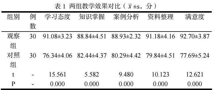 对学习态度、知识掌握情况、案例分析情况、资料整理情况,以及实习生对教学满意情况的判断和收集中发现,各项以评分呈现均为观察组评分高于对照组,P<0.05。见表1。
