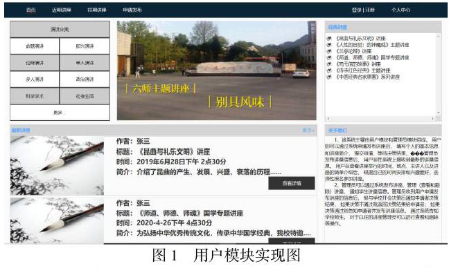 自六盘水师范学院建校以来,学校的校园讲座文化培养了大量的优秀人才,成为学校不可或缺的一部分。随着大数据和互联网在我国越发的盛行[1],六盘水师范学院在管理方面也采用了很多信息化技术。但是在校园讲座这一方面却还存在很多缺陷。目前校园讲座没有统一的信息发布及宣传渠道,都是通过QQ群,摆放海报和教师上课时口头通知等方式告知学生,也变相做了一些宣传。但是这样驳杂而又低效的宣传及发布方式往往得不到想要的效果。本文以六盘水师范学院具体情况为背景,使用HTML、JSP、JavaScript脚本语言、SSM框架、Servlet、MySQL数据库等技术研究设计了一款易于接受,功能全面的校园讲座系统。通过本系统学生可以查看近期讲座信息,报名参加讲座,申请发布讲座,观看讲座回放,讲座结束后跟讲师交流。