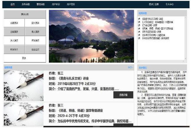 本系统可实现对校园讲座的全面管理。管理员通过本系统可以向广大师生发布讲座信息,用户也能通过系统及时的收到讲座的基本信息,比如举办时间、地点、主讲人等等,也可以管理所有的讲座信息。一般用户通过本系统可以查看所有已发布讲座以及观看这些讲座的回放。对于已经发布了但还没有举办的讲座,用户通过系统可以报名参加讲座,参加讲座可以增加自己的系统积分。对于条件满足的学生来说,也可以通过本系统申请发布讲座。在讲座结束后,如果有学生对于讲座内容还有问题的,也可以通过本系统与讲师留言交流,向老师提出自己的疑问。