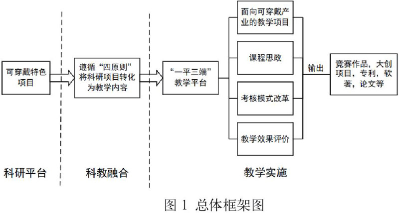 项目的总体框架如图1所示,包括科研平台,科教融合,教学实施三部分,依托可穿戴特色系列项目,遵循“四原则”将科研项目转化为教学内容,借助“一平三端”教学平台进行教学实施,通过改革教学项目内容、课程思政、考核模式以及教学效果评价等方面优化教学实施内容,探索科教融合理念在电子信息类课程的应用,锻炼学生动手实践能力,提高学生的创新能力以及思想觉悟。