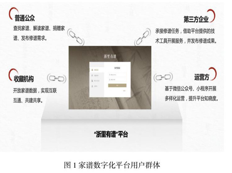 对于群众用户,平台通过家谱公众服务的搭建,满足其寻根问祖、家谱续修等服务需求;对于文博机构、科研院校等人文研究学者,平台利用关联数据技术提供多维度的可视化浏览、语义搜索、家谱知识挖掘等研究服务;对于产业机构,平台提供在线家谱续修、家谱征集等系列工具。通过建立统一支撑应用平台,最终实现有效打破馆藏各类家谱资源数据库相互隔离的封闭状态,推进数据开放,促进知识流动,提升产业应用价值,在开放利用中充分发掘其潜在价值。