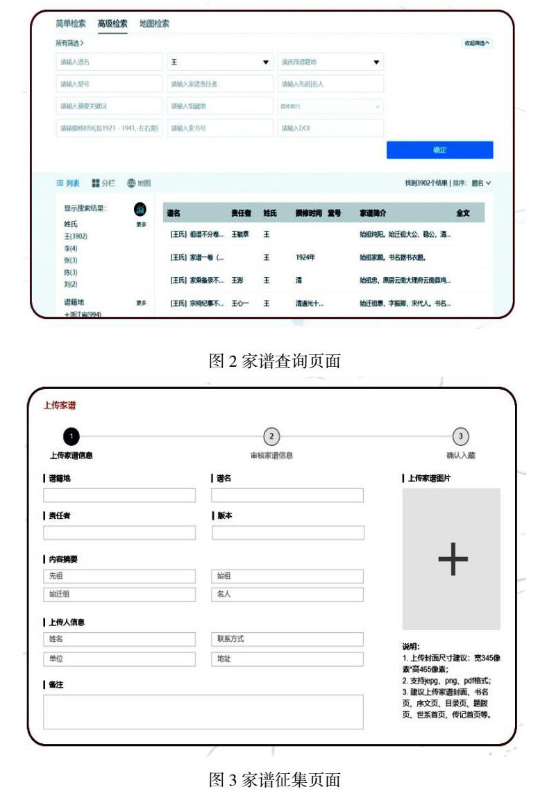 家谱征集:支持用户在线完成家谱捐赠手续;由专家基于用户提供的谱籍地、谱名、责任者、版本、内容、征集方式等信息和家谱图片判断家谱价值以决定是否入藏。