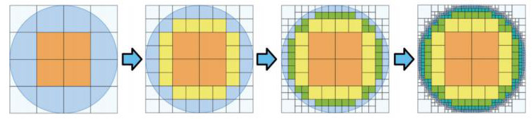 生3:我觉得可以,他的方法是求出最大的正方形以后,把空白的部分再画小正方形进行补充,再求出这些小正方形的面积,周而复始、越来越小,这样就能无限接近圆的面积。