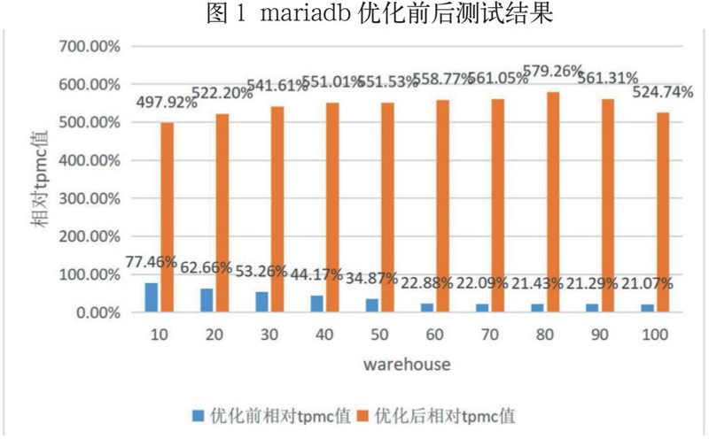 图1是mariadb优化前后的性能测试对比图,本文将terminal值设为100,loadworkers值设为64,通过设置不同的warehouse参数值来进行多轮测试并取平均值作为最终结果,对mariadb数据库的TPC-C基准测试结果值如下图1所示,其中相对tpmc值的算式为:
