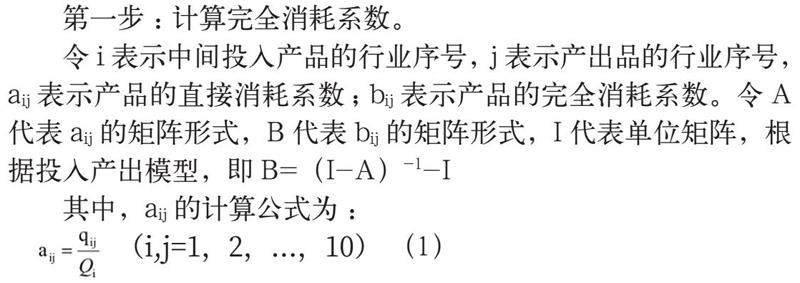 令i表示中间投入产品的行业序号,j表示产出品的行业序号,aij表示产品的直接消耗系数;bij表示产品的完全消耗系数。令A代表aij的矩阵形式,B代表bij的矩阵形式,I代表单位矩阵,根据投入产出模型,即B=(I-A)-1-I