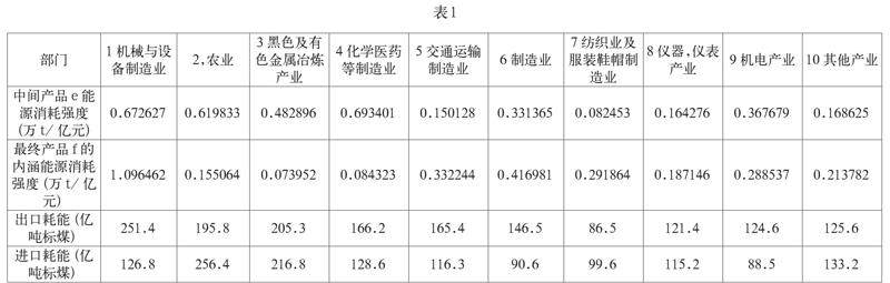 根据上面的计算方法最后得到各部门的中间投入产品e的能源消耗强度如下表(表1)。