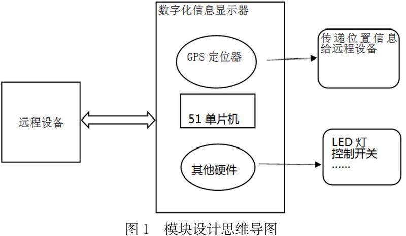 控制信息由远程控制设备生成,通过系统硬件模块中的GPS定位器判断位置信息并且通过51单片机串行通信接口返回位置信息给远程控制设备,远程控制设备中的数据库模块存储了许多地理位置信息,并且将这些数据进行了分组,远程控制设备接受传递的地理位置信息后,通过串行通信接口传递分组信息给51单片机来控制系统硬件该点亮什么颜色的led灯。持有数字化信息显示器者,只需按下led灯开关键即可。模块设计示意图如下: