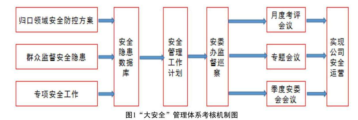 基于风险识别有针对性制定防控措施并明确指标任务,构建安全管理工作月度考评制度、专题会议协调制度、安委办监督巡察制度、季度安委会会议制度、安全管理工作月度通报等。结合安全管理工作计划分门别类纳入各领域进行考核,将安全管理工作的影响力进一步拓宽,营造“安全管理,人人参与”的氛围。由安委办组织并对考核计划完成情况实施审核,要求各部门提供计划完成的见证材料,以实效检验工作质量,切实地将安全管理工作做深做实,建立激励机制,有效发挥各部门在安全管理工作中的主观能动性;同时把重点下沉至固本强基夯实基础管理,推进安全管理工作走深走实,构建了“大安全”管理体系考核机制(如图1所示)。