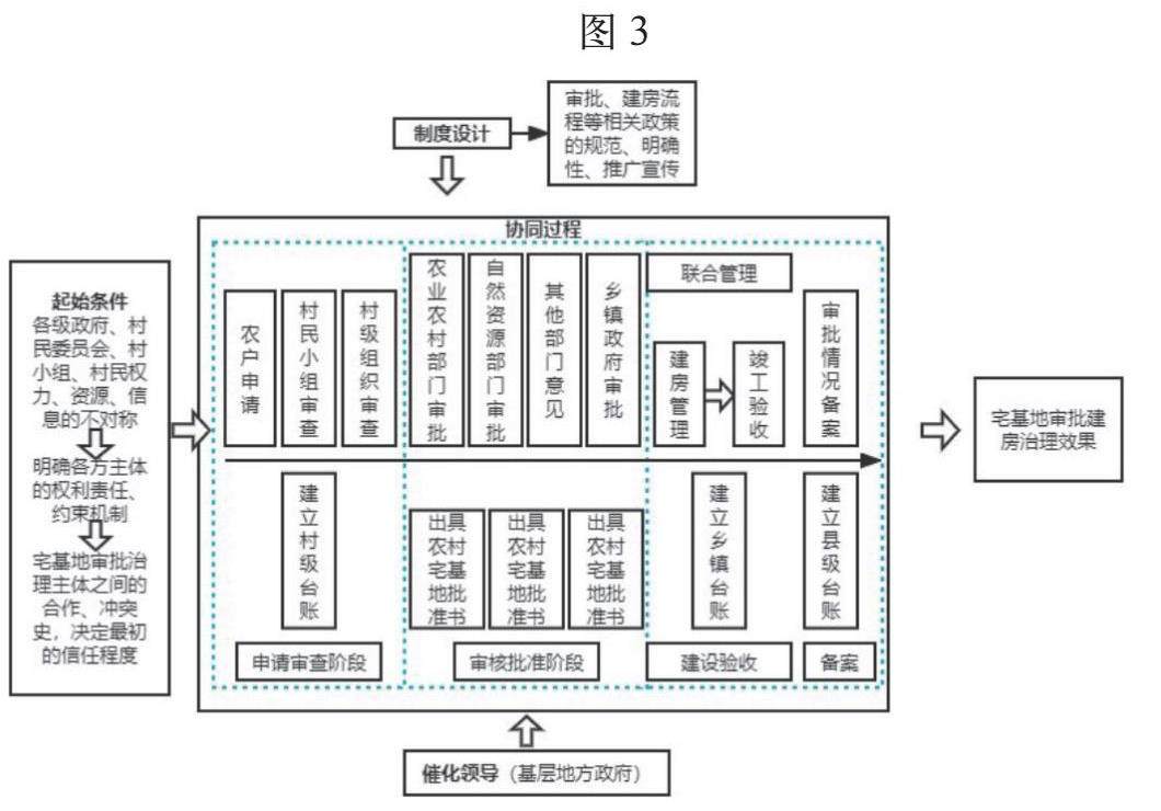 宅基地审批及建房SFIC治理框架,起始条件是各参与主体达成合作关系时已具备的条件。村民的参与自治意愿、基层政府的治理能力、各主体之间的利益诉求、政府和村民之间的资源信息量差距等。催化领导是保障宅基地流转过程达到有效协同的领导力量,是协调参与主体的利益诉求的必要因素。县、乡、村自上而下的协同联动机制,基层党组织的领导协同治理。现阶段乡村治理结构转型,多方主体在乡村治理实践中发挥着不同的功能。制度设计是在协同过程中设定的集体行动规则和制度保障,是提升治理水平、实现乡村振兴战略的重要动力。各相关政策制度、规章和实施细则等明确了各主体的治理权限范围责任,是依法依规行使职责的制度保障。在现有乡村协同治理的实践中,自上而下的制度规范,鉴于不同地区、不同乡约民俗的差距,结合本地实际的制度制定,一定程度政策制定偏差、执行偏差、政策的碎片化、耦合衔接不足,难以形成有效的制度供给,导致多元主体利益冲突,违法乱建等行为越界问题频发。协同过程则是核心,是其它三个影响因素共同导入形成的一个循环过程,对整个流程过程最终治理效果影响最大。一个良性动态的协调治理过程需要建立在信任、投入和共识不断深化的基础上。在宅基地审批及建房过程中,首先充分有效的沟通、及时有效的新政宣传、公开透明的政策执行过程是建立信任的前提。建立审批平台、宅基地现有资源信息公开化、真实有效、过程规范等很大程度上都可以影响整个协同过程的效益程度。由于各参与主体之间职责、文化程度、治理能力、角色定位不同,拥有的资源、信息不对称,利益诉求不同等影响互相之间的信任程度,进而协同动机、积极性不同。为了让各治理主体能够自愿参与协同治理过程,必须着力解决参与协调治理各方权力、资源、知识、信息等的不对称性问题,了解各方的动机、需求、寻求相关的调解因素,增强各方的参与积极性和协同配合能力。只有当参与主体意识到自己与其他主体之间的互相制约、规制依赖关系时,配合协同治理才能发挥作用。