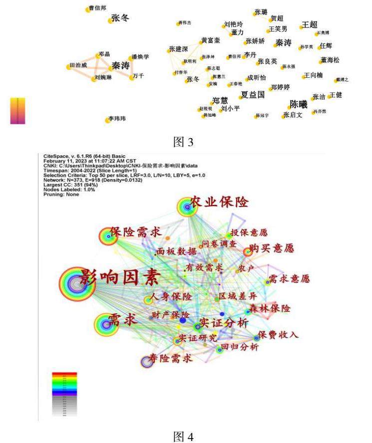 关键词共现分析,可以看出某领域的研究热点等。下图4为关键词图谱,从图中可以看出,“影响因素”出现的频率最高,主要是由于检索词的关键词为“影响因素”,其次“农业保险”、“需求”也是两个关键词的出现频率也较高。检索主体为保险,集中出现农业保险,说明在对保险影响因素研究文献方面,比较关注农业保险的发展及影响。这与我国是农业大国,农业保险发展完善有较大关系。除了农业保险,在寿险需求、财产保险、森林保险等也有一定的研究。随着保险业逐步发展完善,之后在保费收入、购买意愿和投保方面也有进行了深入研究,在研究主体上进行了拓展。研究手段上,通过面板数据或者问卷收集区域数据,运用回归分析进行实证研究,分析出影响保险需求的显著因素,并提出改善建议。