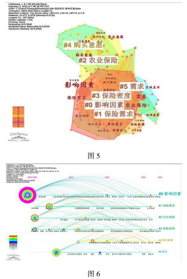 关键词聚类,是通过算法将关键词科学聚类,当聚类的模块Q值>0.3时,聚类平均轮廓S值>0.7,则结果相对显著及可信。图5为关键词共现图谱,其中Q值为0.5242,S值为0.8709,因此该聚类图谱的聚类结构十分显著,结果可信。从关键词聚类图可以看出,目前针对保险需求影响因素研究主要分为6大块,分别为影响因素、保险需求、农业保险、保险密度、购买意愿、需求。保险需求影响因素一般宏观经济因素、人口、国家政策、社会环境、产品价格因素等。