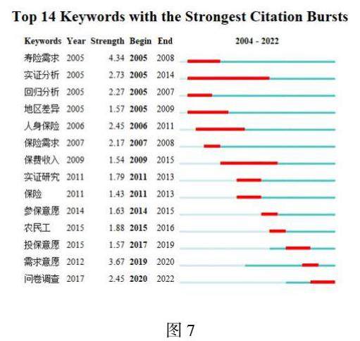 突现词的出现代表着研究热点的出现与消失,关键词突现图可以清晰表达保险需求影响因素研究在某一时间段的热点以及未来研究方向。图7展示了近20年来我国保险需求影响因素研究领域前14个关键词突现情况。由于CiteSpace不能解析CNKI数据库的被引用量数据,因此在研究关键词共现和关键词聚类分析时,首先选取关键词出现频次最高的文献,在选取被引用量靠前文献,综合判断提炼出热点词语。2000年至2010年期间,研究的主要热点是寿险需求、地区保险差异研究、人身寿险研究等,主要均是通过实证分析的手段,得出相关分析结论。2000年之后,研究方向有了新的拓展,保费收入、参保意愿、投保意愿等,这说明对于保险需求影响因素的研究,随着时间推移,研究内容也在不断发生变化。
