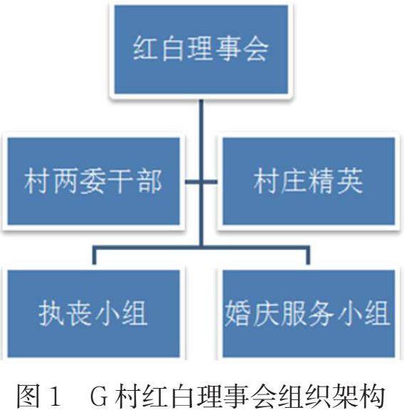 红白理事会是时代变革应运而生的产物,各种移风易俗政策的出台使得红白理事会具有了政治合法性和实质性的社会意义,它的出现是乡村自身发展、村民观念转变和社会治理的多重需要。组织结构上,G村成立了由村干部兼任的红白理事会,成员组成大部分是村两委中的领导干部,以及几个较有威望的、懂得婚丧仪式的地方经济、文化、社会精英分子。下设执丧小组和婚庆服务小组,协助丧主和喜主处理丧事与婚事(如图1所示)。