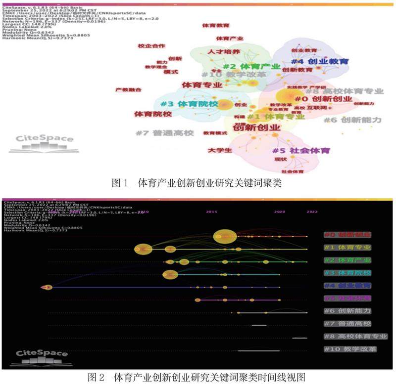 在体育产业创新创业教育上,筛选中国知网数据库”创新创业教育”和”体育”两个方面的文献,检索到172篇期刊论文。借助CiteSpace软件对该172篇文章的关键词进行聚类和演变分析,得到聚类结果(图1所示)。可见,我国关于体育产业创新创业教育研究以“创新创业”关键词为核心,并由此延伸出两大研究方向。一个是以产业为核心结合高等教育领域中的创新创业教育,另一个是以体育事业为核心,关注社会体育等领域中的体育创新创业教育。