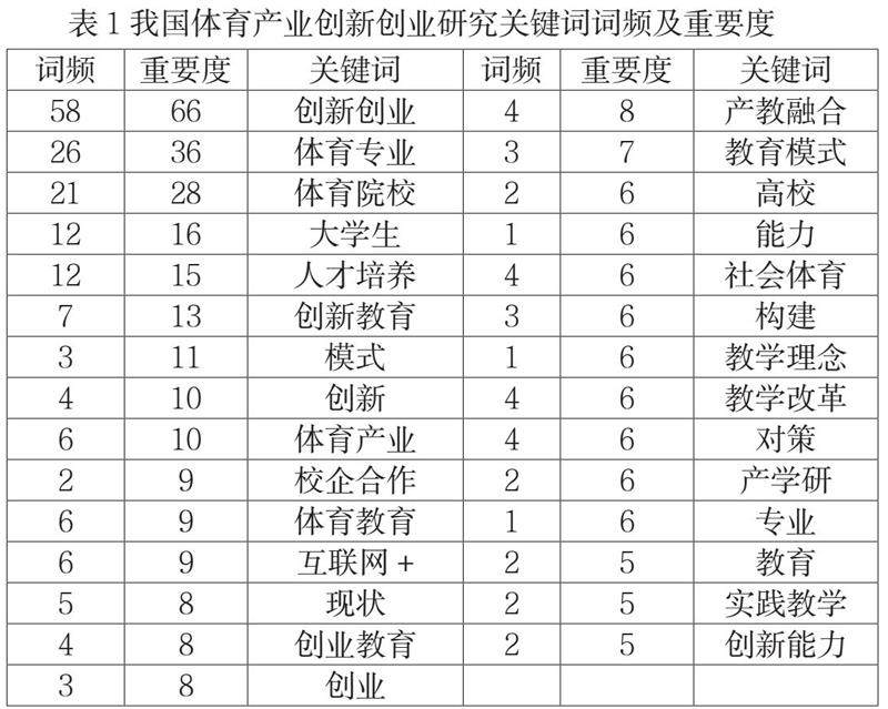 根据CiteSpace算法得出的关键词排序情况,可以看出体育产业创新创业教育研究的关键词中,重要度和出现频次趋势基本相同,出现频次多于10次的关键词包括“创新创业”、“体育专业”、“体育院校”、“大学生”、“人才培养”,这些关键词虽然出现频次高,但该领域不可避免的研究内容,对于研究方向没有明确的区分性,转而观察出现频次低于10次,但重要度高于10的关键词,这些关键词包括“创新教育”、“模式”、“创新”、“体育产业”,通过这些关键词可以看出在创新创业教育中,创新精神的教育更重于创业教育,同时,我国体育产业创新创业教育模式也是学界主要关注的研究方向,具体研究的模式内容也可从重要度第二梯队的关键词中窥见一斑,例如“校企合作”、“互联网+“、”产教融合“、”产学研“等。如表1所示。