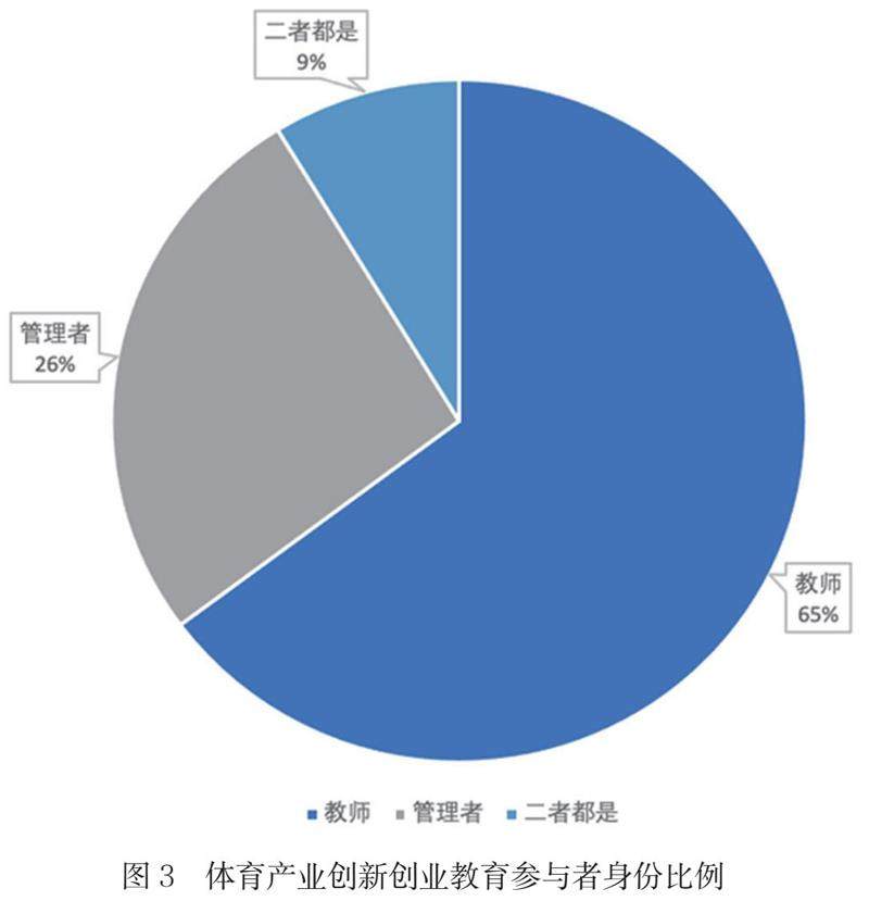 在调研中,对体育产业创新创业教育工作参与主要人群进行了统计调研,其中,代表高校主体的教师身份参与者占比达到了65%,而企业管理者占比仅有26%,显示出在我国体育产业创新创业教育生态系统中,高校和市场的参与度差异显著。高校作为行政主体,必须完成政府以行政指令下达的创新创业教育要求,而企业对参与创新创业的兴趣不高,说明市场体制在创新创业教育中所发挥的推动作用较低。如图3所示。