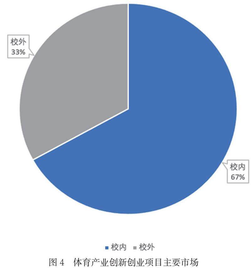 在调研中,对我国体育产业创新创业项目的主要市场进行了调研,其中60%以上都以校内市场为主,而校外市场的项目占比仅33%,从这一占比情况中可以发现,尽管很多高校都开设了众创空间等校企合作的形式和平台,但是从实际的效果来看,对于高校学生的创新创业教育培养依然没有突破高校的边界,校企合作的深度还远远不足。如图4所示。