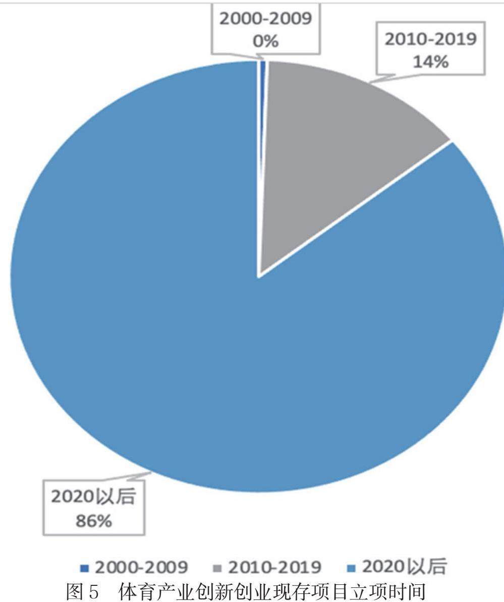 我国近年来开办了多项创新创业有关的赛事,各类赛事每年都会有成百上千的项目经过审议成功立项,在我国高校体育产业创新创业调研中,对当前还在运营的创新创业项目的立项时间进行了统计,统计结果发现,当前存续的体育产业创新创业项目绝大部分立项于2020年以后,仅仅持续了三年以上的立项项目也只占总数14%。从这一数据可以推断出,绝大多数的体育产业创新创业项目都在立项后的两到三年内,获得市场化的成果之前就结束运营,却没有针对项目运营的信息统计和反馈,究竟是什么原因导致了体育产业创新创业成果如此短命也鲜有研究。如图5所示。