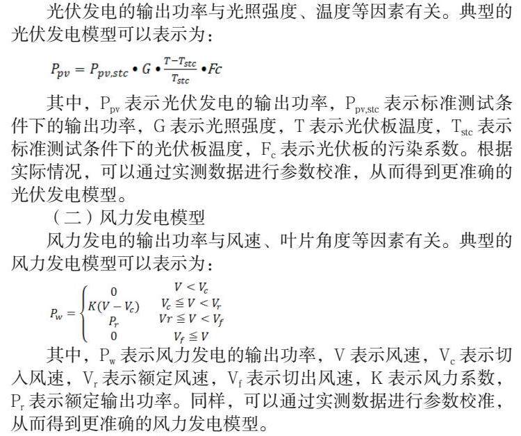 其中,Pw表示风力发电的输出功率,V表示风速,Vc表示切入风速,Vr表示额定风速,Vf表示切出风速,K表示风力系数,Pr表示额定输出功率。同样,可以通过实测数据进行参数校准,从而得到更准确的风力发电模型。