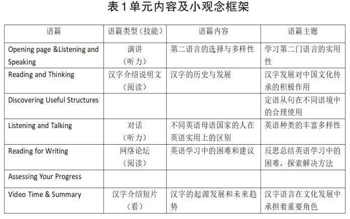 本单元主题为世界语言(如表1)。Listening and Speaking语言活动主要是听说,话题为讨论第二语言的选择与多样性。Reading and Thinking语言活动为阅读,话题为汉字语言的历史与发展,强调了汉字发展对中国文化传承的积极作用。Listening and Talking的听力内容主要深入讨论了不同母语国家的人在英语实用上的区别,让学生了解到英语种类的丰富多样性。Reading for Writing的语篇特点是一篇网络论坛跟帖,描述了二语学习者在英语学习中遇到的困难和提出的可行性建议。Video Time则是一节汉字介绍视频短片,展示了汉字的起源以及对汉字未来趋势发展的预测,显示汉字语言在文化发展中得承担着重要角色。