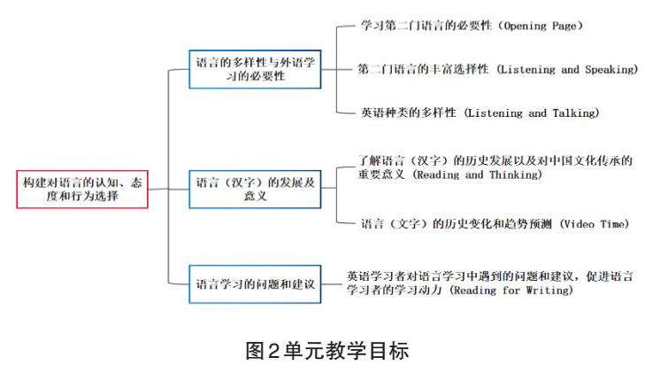 基于对本单元内容的梳理以及提炼出的若干小观念。围绕大观念和小观念,单元整体教学目标确定为:学生能够了解语言多样性,认识语言重要性,思考外语学习动机,促进语言学习。在单元大观念和整体目标的引领下,整个单元教学内容和框架重新梳理如图2所示。