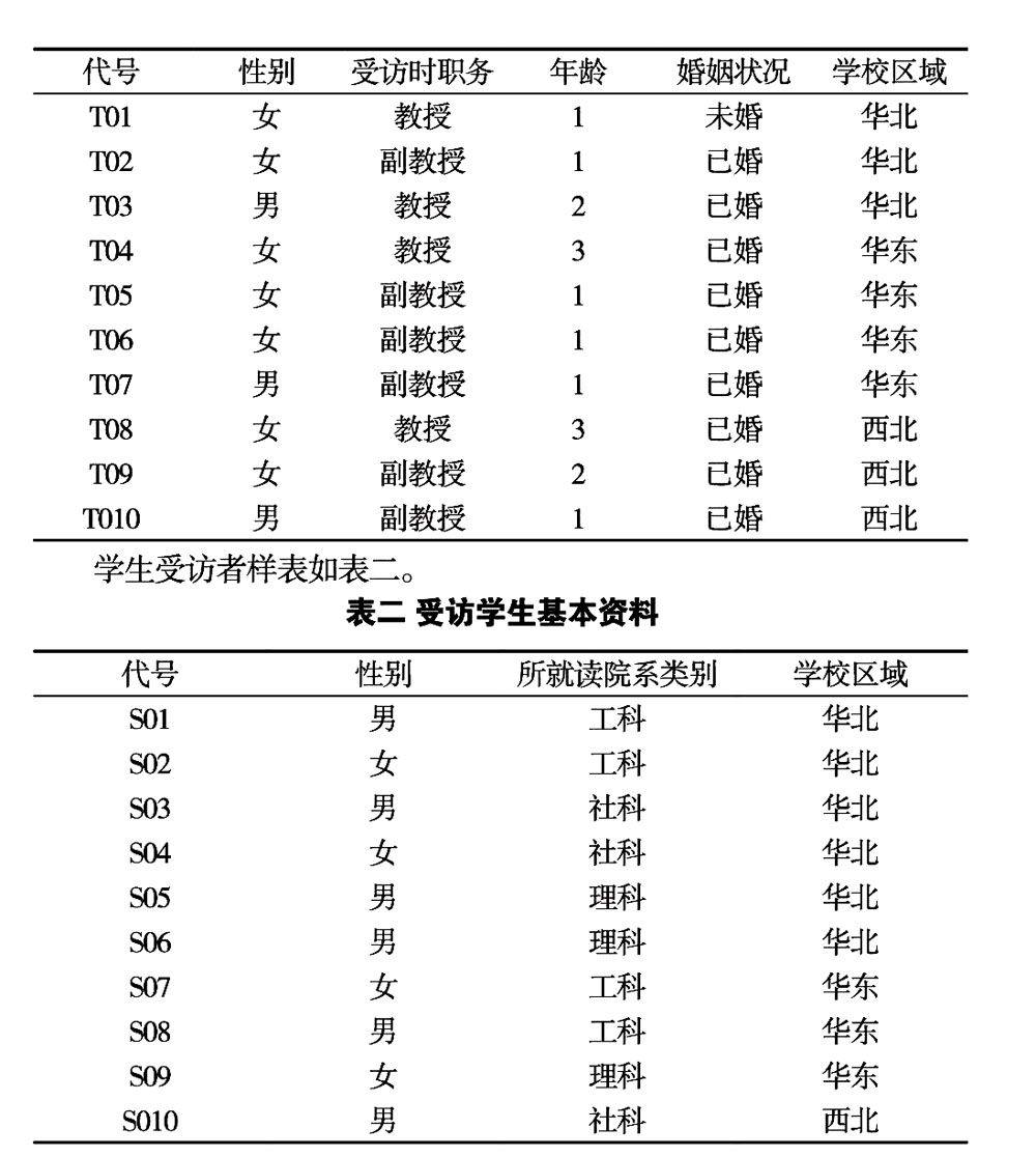 本研究电话访谈了不同高校的学生和老师,共访谈了10位副教授职位以上的高校教师,其中有7位女性教师,3位男性教师;10位学生,其中4位女学生,6位男学生。其中取样的教师职务分为教授和副教授,年龄划分为五段分别为:1、30~35,2、36~40,3、41~45,4、46~50,5、50~60;学校区域按通用标准划分为华东、华北、东北、华南、中部、西北、西南;所就读学科类别也按通用标准划分为工科、理科和社科等类。教师受访者样表如表一。