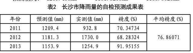 为评定模型的可靠性,规定预测的平均精度达到95%为合格。但由表2可知,用灰色系统模型GM(1,1)进行长沙市年降雨量预测的精度不够且不稳定,其准确性有待提高。