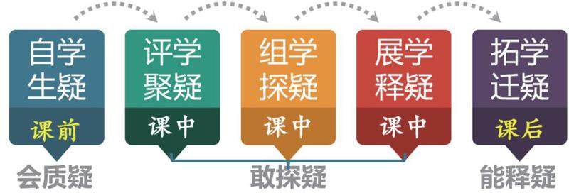 1.三阶五环:三阶是学疑课堂的三个推进阶段,分别课前自学——课中组学——课后拓学,也是学生解决疑难问题的三个阶梯:会质颖——敢探疑——能释疑,五环是指学习流程的五个环节:自学生疑——评学聚疑——组学探疑——展学释疑——拓学迁疑。