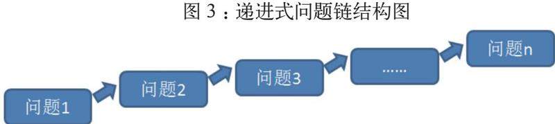 递进式问题链是指问题与问题之间是递进关系,前一问题的解决为后一个问题服务,问题逐渐由浅层次走向深层次的问题串。此类型的问题链用于对命题或概念的纵向探究或者逐步抽象到一般化问题时,这和人类认识事物的顺序一致。它的结构一般如下图3: