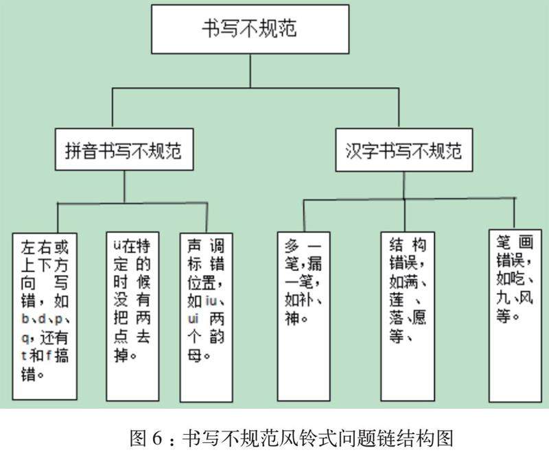 【案例呈现】在小学低段教学中,学习正确、规范地书写,养成良好的写字习惯是需要落地的核心素养。但是,书写不规范似乎是小学生汉字书写中普遍存在的现象,特别是小学低段学生。教师通过设计“火眼金睛来找茬”和“一起来当小老师”等活动,让学生小组合作搜寻,归纳梳理出错原因。如拼音书写不规范:主要是左右或上下方向写错;ü上两点的处理;声调标错位置。汉字书写不规范:主要是多一笔或漏一笔;结构错误;笔画错误等。具体如图6所示。