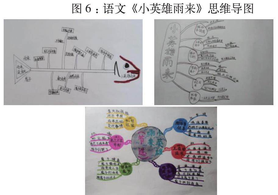 【案例呈现】如在《小英雄雨来》教学中,如何把握文章的主要内容为教学重点。教师通过指导学生“围绕着主人公雨来发生了哪些事情?”制作思维导图。学生理清了文章的六件事情:游泳本领高、上夜校读书、掩护交通员、与鬼子斗争、宁死不屈以及机智脱险。依据自己的兴趣点,如加入雨来的心情,体会雨来的品质;加入鬼子的部分,对比体会雨来的形象等,绘制了形式不一的思维导图,见图6,通过这样的“妙招”展示,学生对于文章内容的理解,也就更加的全面。