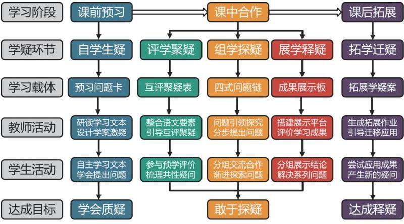 基于以上分析,在小学语文教学中提出“学·疑”课堂的变革方向,并建构“三阶五环”模式,以引导学生会质颖,敢探疑,能释疑。