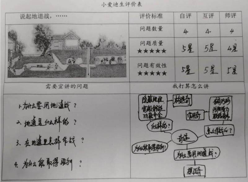 【案例反思】结合情境设置,把自学生疑变成红色宣讲任务。借助影片和课文内容的自学,既锻炼学生的质疑探究能力、语言表达能力,又促进学生对本文地深入理解。小爱迪生评价表具体的内容设置因课而不同,但是评价标准基本不变的,导向学生多提问,提好问,会提问,使学生成为课堂的主人,让学生对自己的学习负起更多的责任。