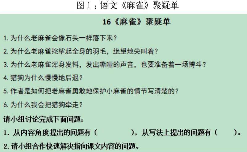 【案例呈现】在《麻雀》一课中,教师课前批阅了学生的预学问题卡,发现学生提出的问题,主要集中在针对课文内容上,以及课文写法上。教师将学生们的问题梳理、整合、汇总形成了如图1聚疑单。