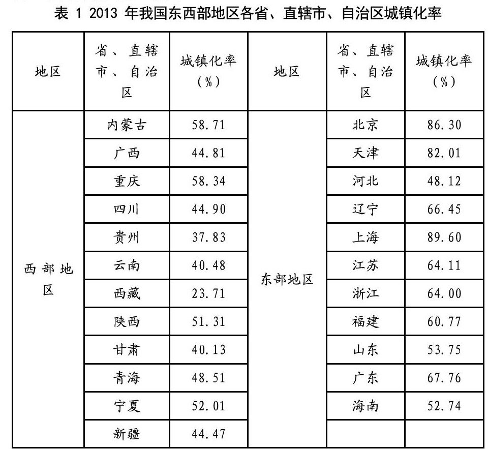 对于城镇化建设,十六大提出了“走中国特色的城镇化道路”,十七大的进一步补充是,“按照统筹城乡、布局合理、节约土地、功能完善、以大带小的原则,促进大中小城市和小城镇协调发展”[1],党的十八大明确提出了“新型城镇化”概念,中央经济工作会议进一步把“加快城镇化建设速度”列为2013年经济工作六大任务之一。我国目前在大力推进新型城镇化建设,我国西部地区土地辽阔、人口和民族众多,各类资源丰富,是我国经济社会发展和现代化进程的一个重要组成部分,所以研究西部地区新型城镇化对我国现代化建设有着重要意义。
