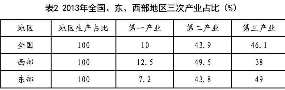 由表2得,2013年,西部的产业结构中,三次产业增加值占西部地区生产总值的比重分别是12.5%,49.5%,38%,呈现“二三一”的产业结构特征。同期,全国平均为10%,43.9%,46.1%;东部为7.2%,43.8%,49%。由此可得,西部地区存在着产业结构不合理的现象,其中第一产业和第二产业占比偏高,而以服务业为主的第三产业占比过低,发展严重滞后。由于地理位置的限制,西部地区主要靠矿产初级开发、石油化工业、装备制造业及化学工业等来发展,形成了以重工业为主的产业特征。“二三一”的发展模式严重影响了西部地区的新型城镇化。