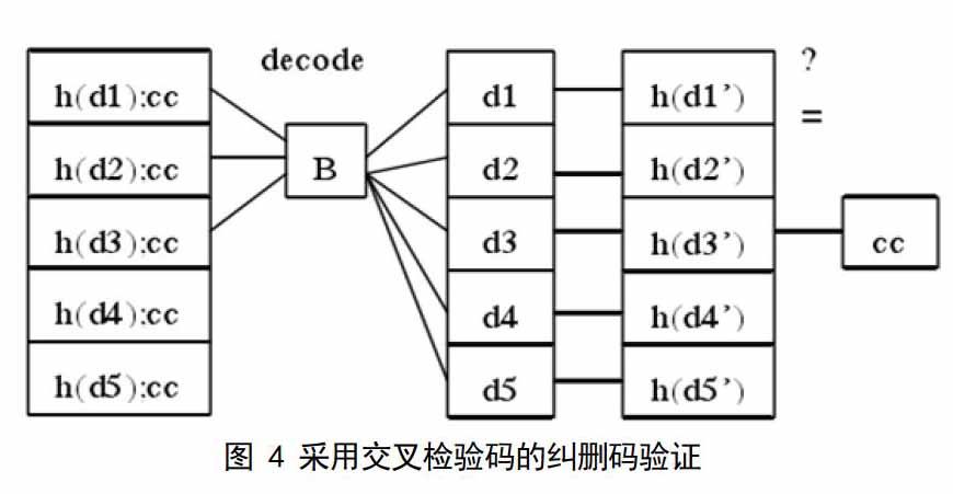 一般情况下,客户读操作时先从读取到的分片中恢复出数据块 B’,然后用纠删码将 B’编码生成n个分片,再分别哈希每一个分片,与交叉检验码中的对应部分相比较,如果全部都一致,那么数据验证成功,即重构的源数据是正确的,编码前的数据是相等的,代码如下,验证过程如图4所示[4]。
