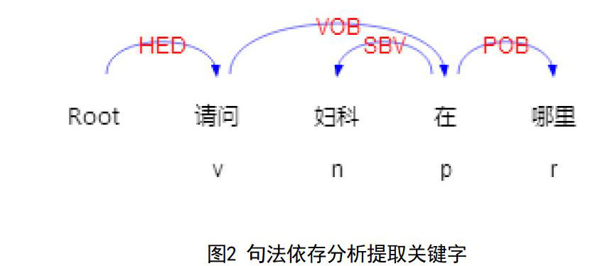 问句的依存句法分析能更直观清楚地获取语言单位内成分之间的依存关系并揭示其句法结构,像针对医院导医系统的问题来说,主要关注是SBV和POB主谓关系和介宾关系,本文通过哈工大LTP的依存句法分析器分析出问题文本的依存句法,结合之前的提取的关键字“妇科”,联系SBV和POB提取出“在”和“哪里”这些谓词和宾语,,而“哪里”根据词性标注结果被提取成为句子疑问词关键字,然后抽取出谓语,通常距离疑问词最近的原则来抽取谓语[2]。