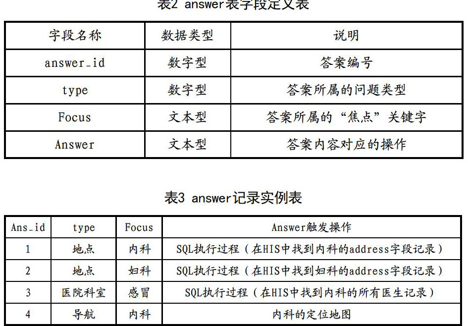 如用户输入”请问妇科在哪里?”,系统分词处理后“妇科”是第一关键词,然后通过句法依存分析提取出关键字所在句法结构中和她联系密切的句法,然后提取出相关的疑问词和谓语词分别是“在/哪里”,在系统数据库中找到匹配的相关疑问词或关键字,找出对应的问句类型,然后根据问题焦点词 “妇科”进行二次匹配,如果找出相应的匹配词汇或近似匹配,就代表匹配成功,找出数据表对应的类型字段type是“地点”,然后按照Type=”地点”找出answer对应的字段里的预设好触发SQL处理过程脚本代码,如anwser对应的是SQL查询记录返回address,则此时系统会去HIS后台,通过address 字段读取相关妇科的地址在哪里,然后将答案返回给用户。如果所有关键字按照顺序,在问题分类和焦点词里面都无法找到,就返回一个找不到答案的警告给用户。