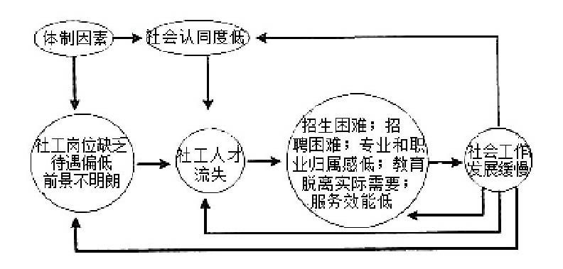 社工从业者的数量有限、专业技能不足,社会性资源筹集困难。社工教育人才与社会需求相脱节的现象。首先,师资力量的严重不足,专业素质的欠缺;其次,专业实习课程课程设置的不合理,学生实务能力低;此外,教学内容与社情、民情缺乏一致性。人才培养体系落后导致社工专业学生的就业障碍,影响其就业积极性。